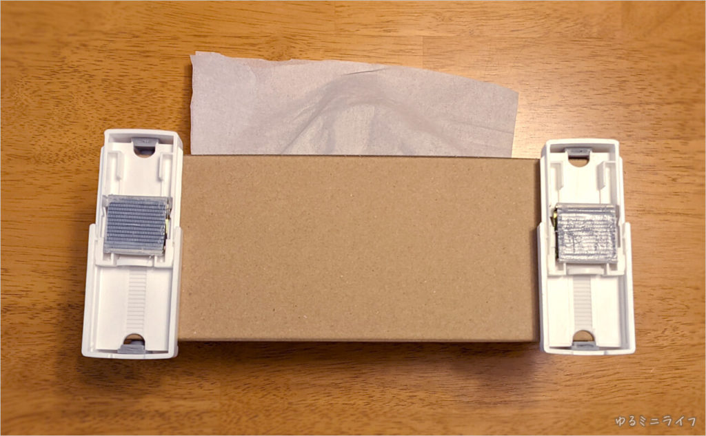 ティッシュボックスにホルダーを取り付けて、金具にくっつけて完成。